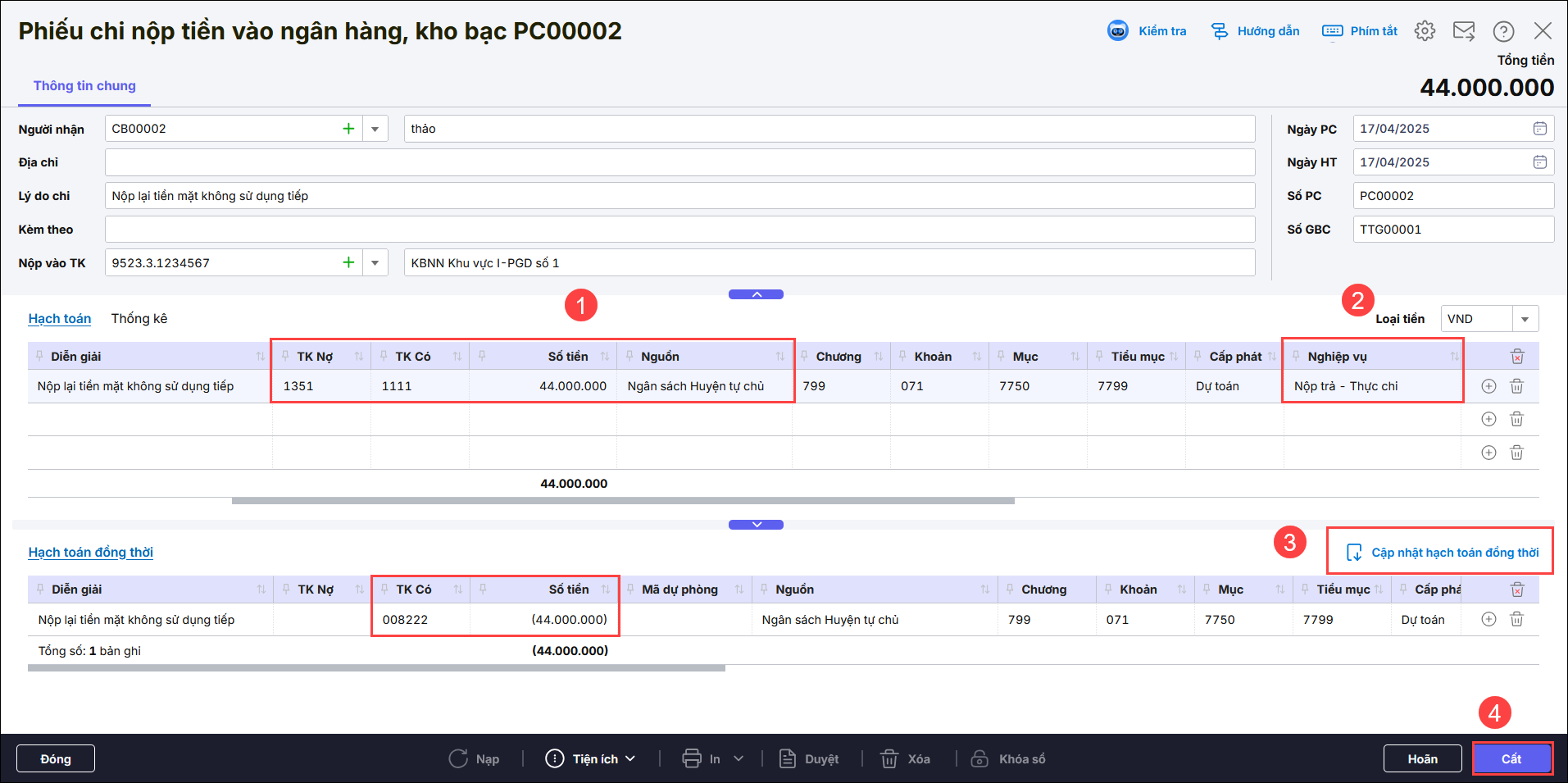 • Nhấn Cập nhật hạch toán đồng thời, hệ thống tự động hạch toán TK Có – Số tiền âm tương ứng với nghiệp vụ đã chọn.