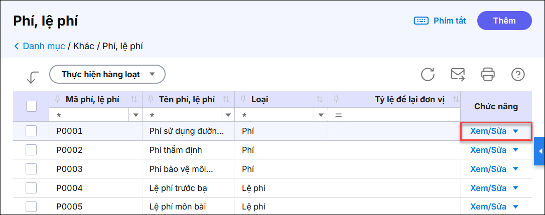 Bước 2: Tích đúp hoặc nhấn Xem/Sửa tại dòng Phí, lệ phí cần sửa.