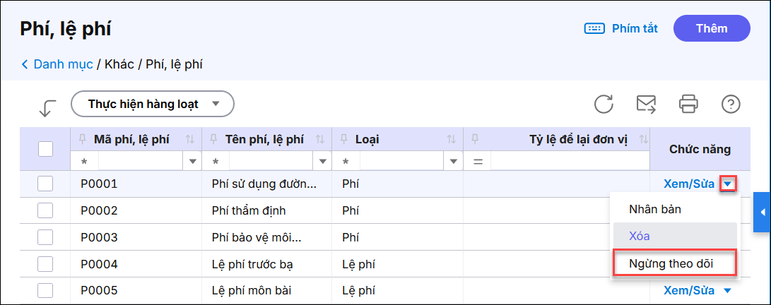 - Nếu Phí, lệ phí đã có nhưng không muốn hiện ra để tránh chọn nhầm khi nhập chứng từ thì chọn Ngừng theo dõi.