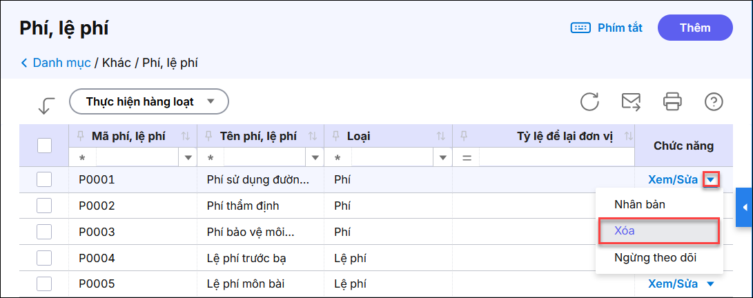 Bước 2: Tại dòng Phí, lệ phí cần xóa, Nhấn chuột vào biểu tượng mũi tên cạnh chức năng Xem/ Sửa, chọn Xóa.