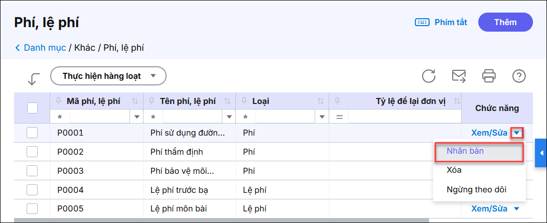 Bước 2: Để thêm mới phí, lệ phí, nhấn Thêm. Hoặc nhấn vào biểu tượng mũi tên ở dòng phí lệ phí đã có chọn Nhân bản để thêm phí, lệ phí mới tương tự Phí, lệ phí đã có.