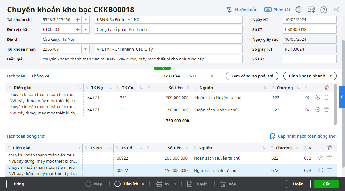 – Ngày 10/05/2024, đơn vị chuyển khoản kho bạc thanh toán tiền mua NVL xây dựng, số tiền 200.000.000đ và mua sắm máy móc: 150.000.000 đ.