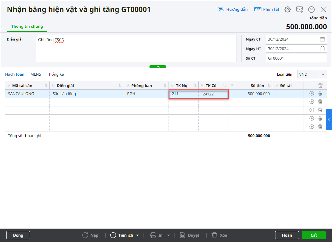 6. Trên chứng từ Nhận bằng hiện vật và ghi tăng tài sản cố định, hệ thống tự động hạch toán TK Nợ 211, TK Có 511. Anh/chị sửa lại TK Có 24122. Nhấn Cất.