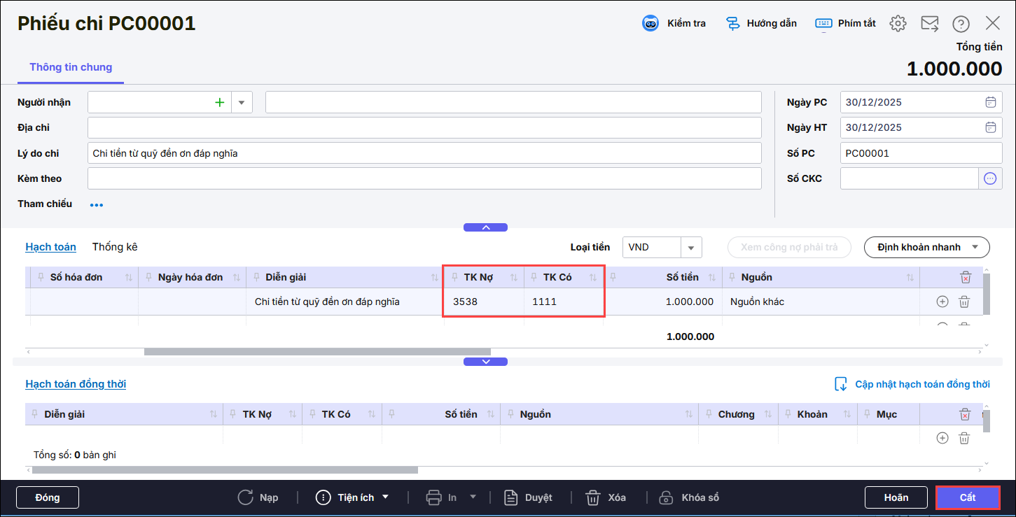 Lưu ý: Nếu rút tiền từ tài khoản tiền gửi về rồi mới chi thì làm theo hướng dẫn tại đây trước rồi mới làm phiếu chi.