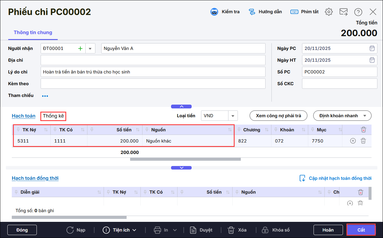 Bước 3: Nhấn Cất. 4.7 Trích lập nguồn CCTL (40%) và trích lập các quỹ theo quy định
