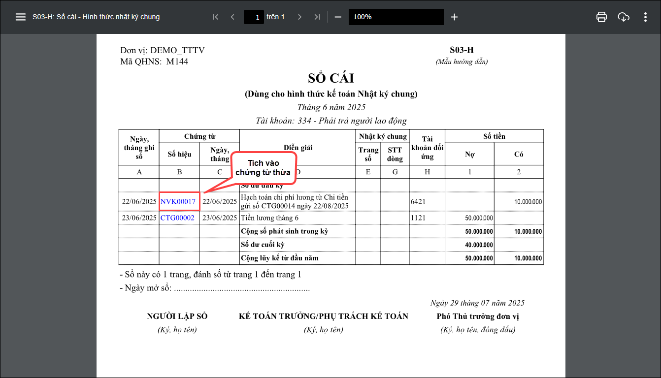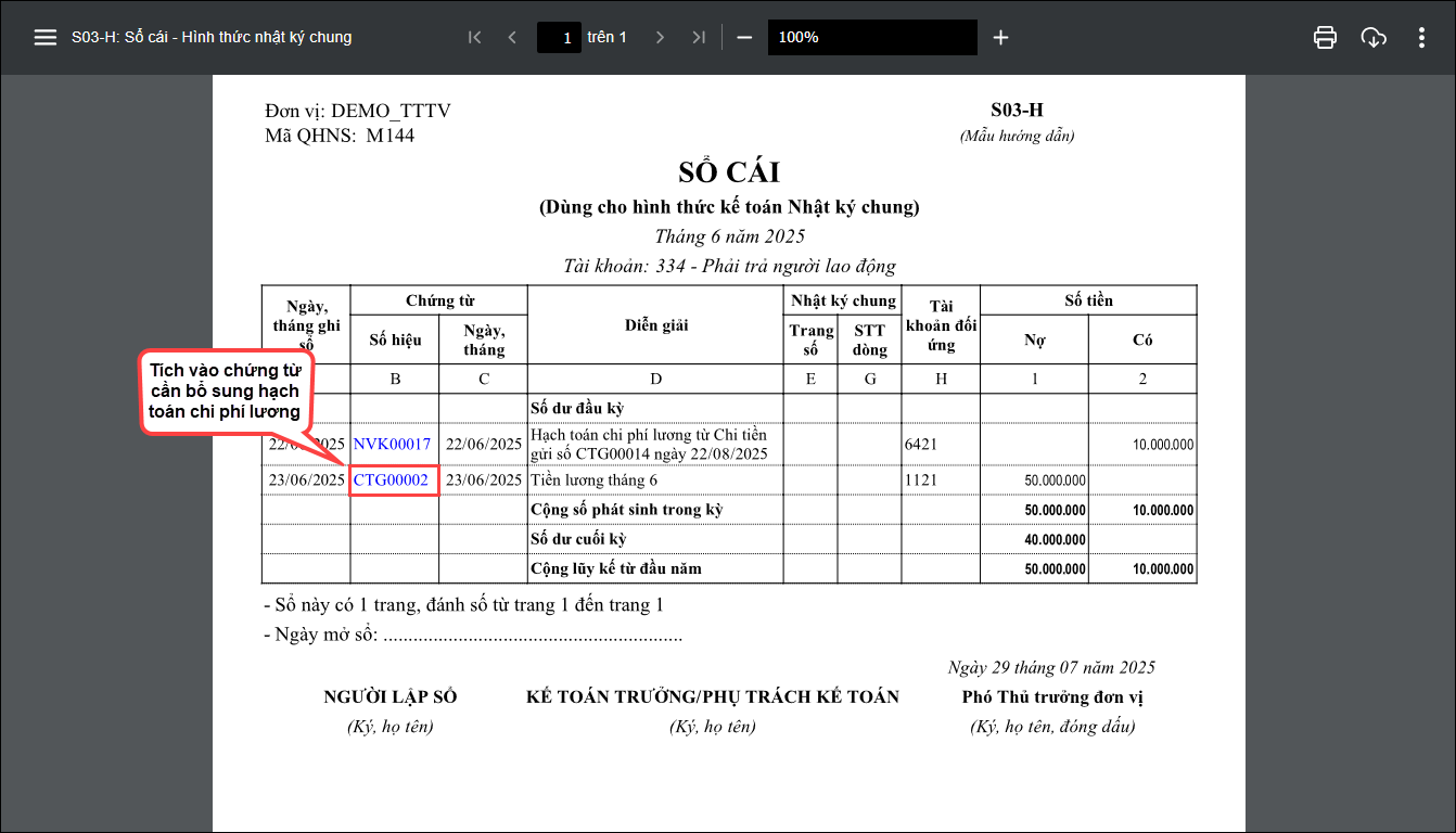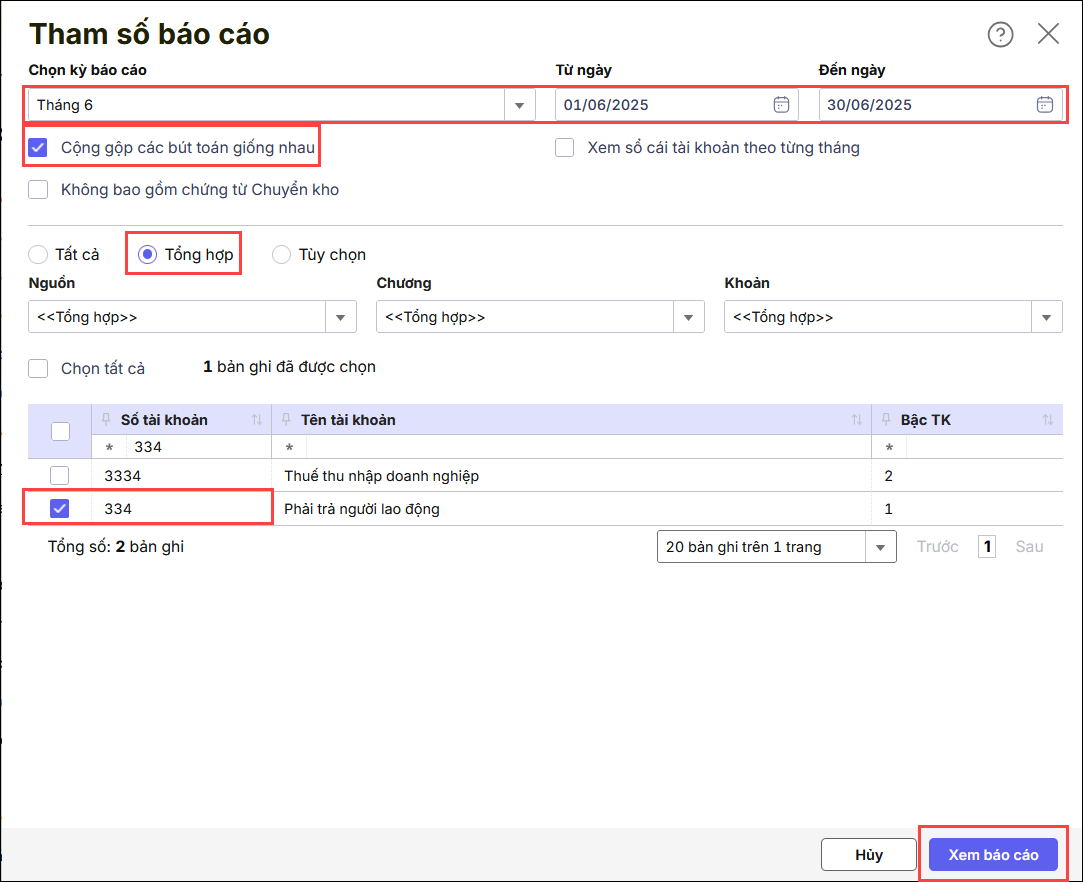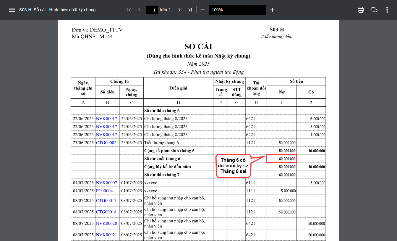 Vào báo cáo/ sổ kế toán / S03H: Sổ cái- Hình thức nhật ký chung chọn tháng bị sai, tài khoản 334, tham số tổng hợp để kiểm tra