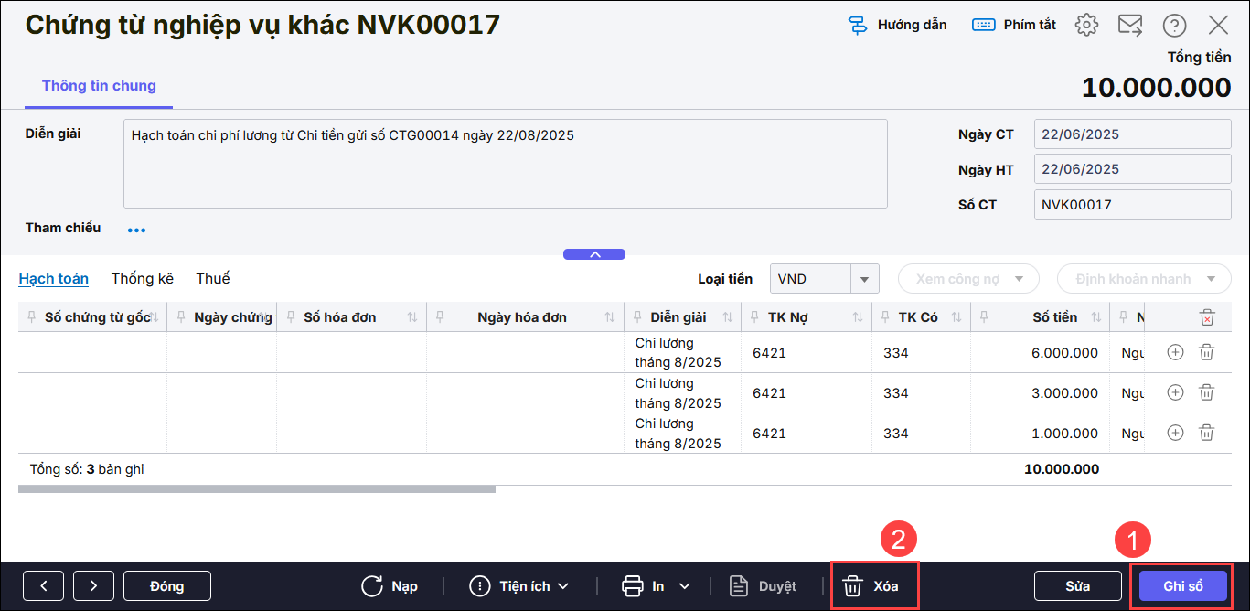 - Số tiền bên Có: Bút toán hạch toán chi phí lương (Nợ TK 611,612,154,642/Có TK 334)