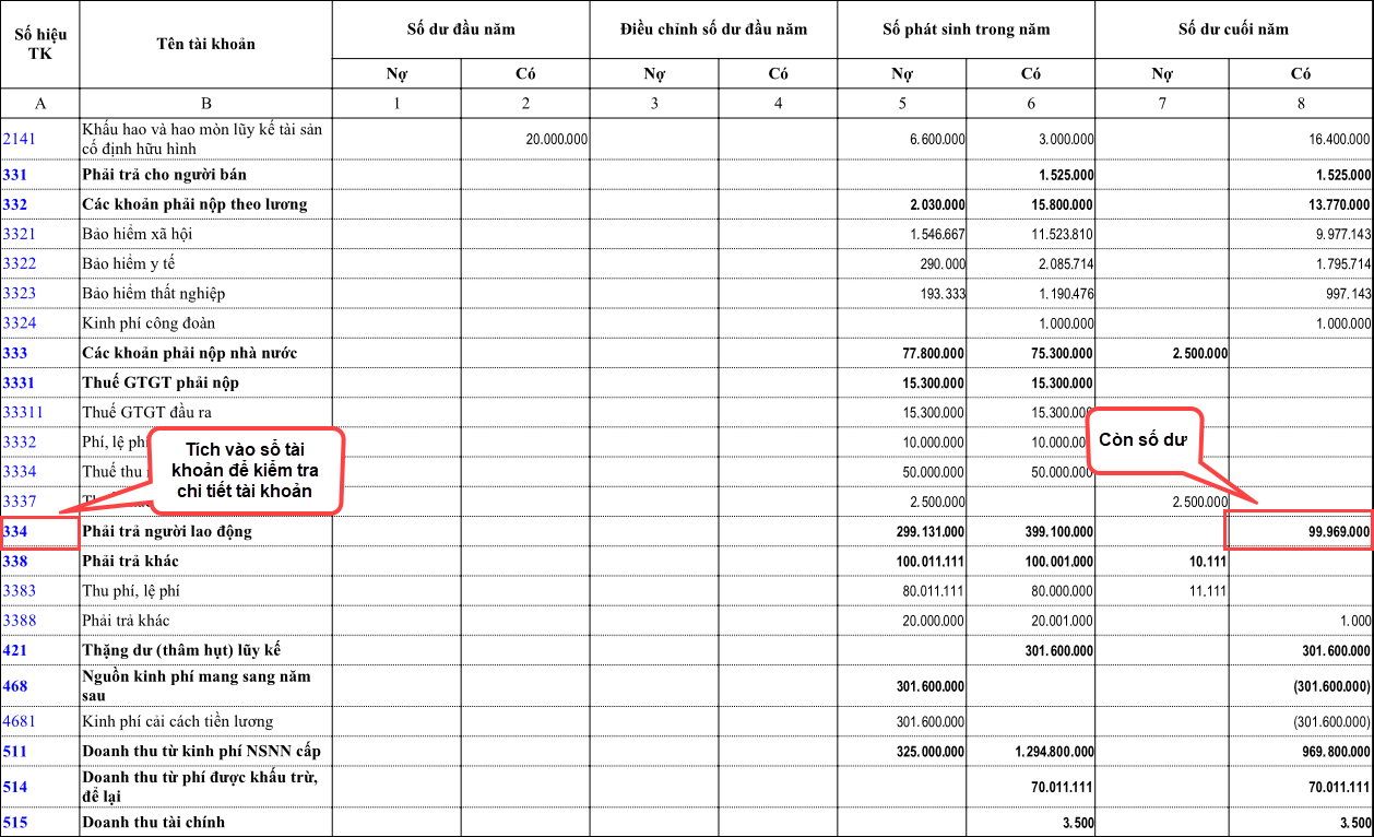 Trường hợp không nợ lương hoặc trả thừa lương nhưng trên báo cáo S05-H: Bảng cân đối số phát sinh vẫn còn số dư ở tài khoản 334 bạn kiểm tra qua 3 bước sau: