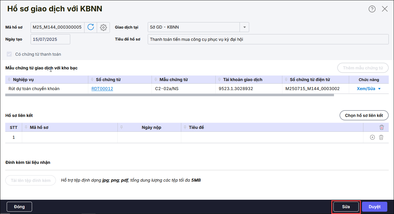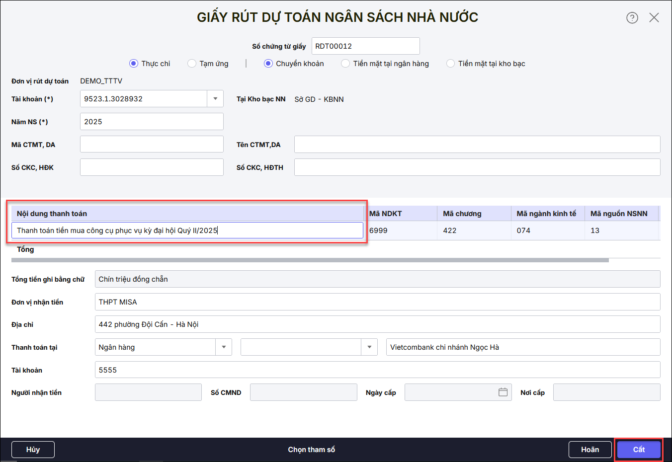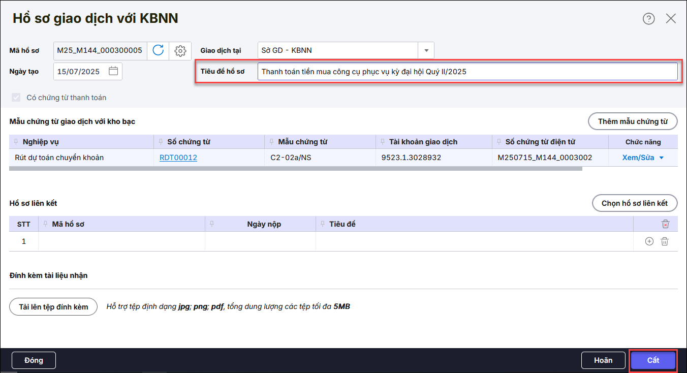 Ví dụ: Chỉnh sửa nội dung diễn giải tiêu đề hồ sơ thành “Thanh toán tiền mua công cụ phục vụ kỳ đại hội Quý II/2025”