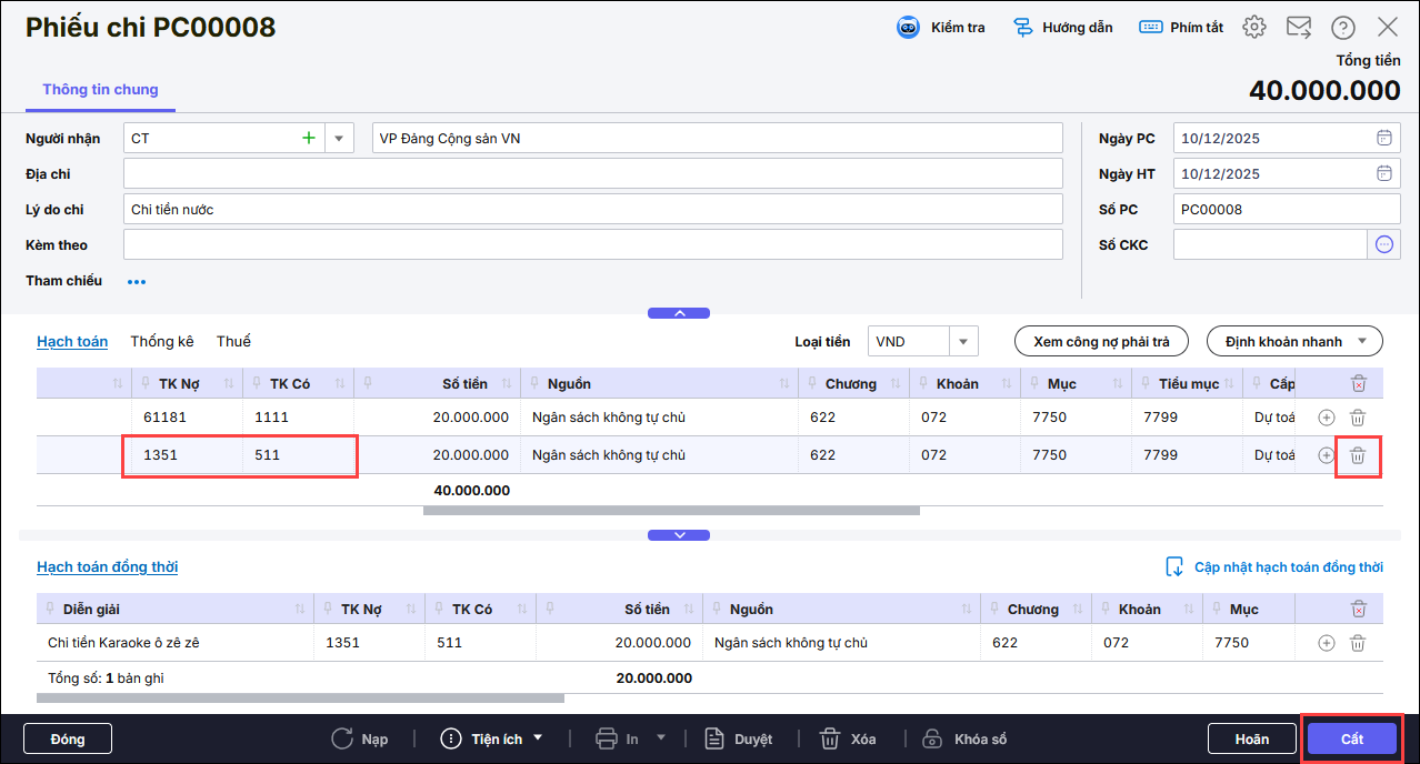 Mở các chứng từ chi tạm ứng đã làm, kiểm tra nếu có tự hạch toán thừa bút toán Nợ TK 1351/ Có TK 511 thì thực hiện Bỏ ghi, nhấn sửa, nhấn vào biểu tượng thùng rác (🗑️) ở cuối dòng để xóa dòng thừa đi -> Nhấn Cất