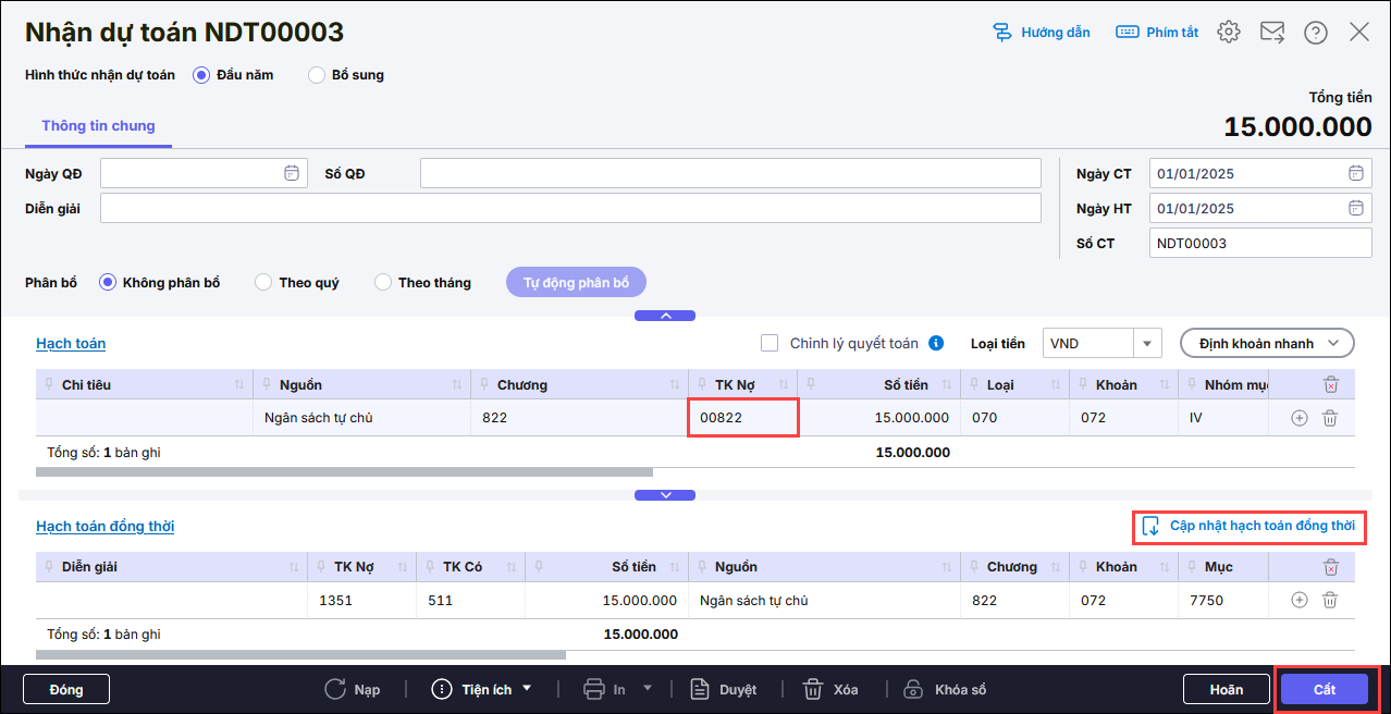 Vào lại các chứng từ Nhận dự toán và Điều chỉnh dự toán của nguồn giao tự chủ kiểm tra đã hạch toán đúng Nợ TK 00822 chưa và nhấn Cập nhật hạch toán đồng thời