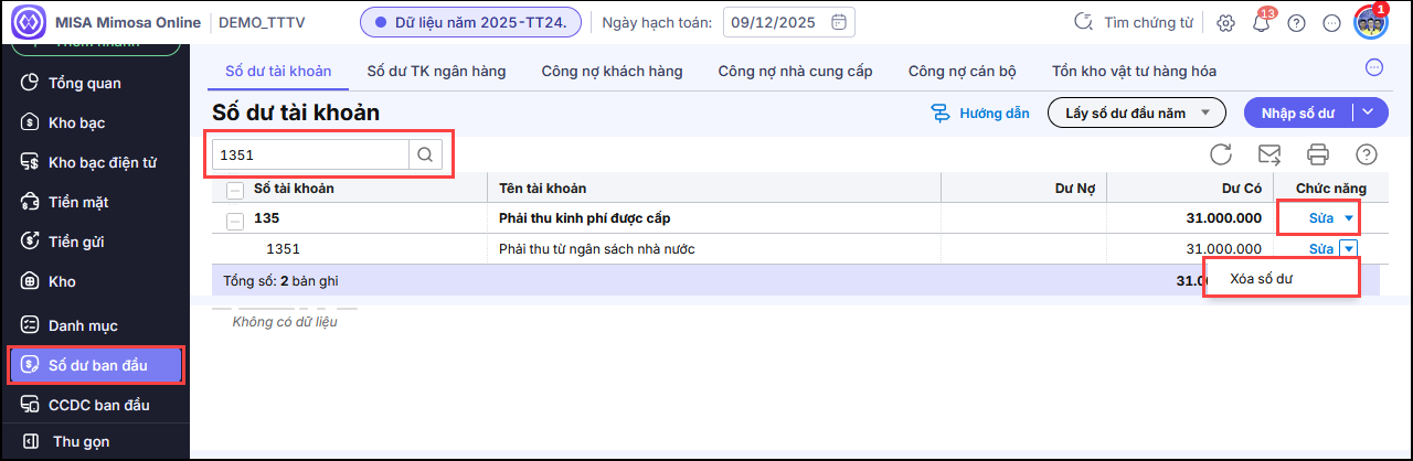 Nếu không còn số dư nào nhưng vẫn hiển thị có số dư TK 1351 thì thực hiện nhấn vào ký hiệu tam giác (⏷) ở bên cạnh chức năng Sửa, nhấn Xóa số dư, nhấn Xóa