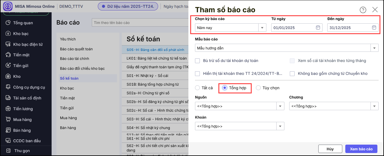 Khi mở báo cáo S05-H – Bảng cân đối số phát sinh, tại bảng tham số kiểm tra lại khoảng thời gian cần xem rồi chọn Tổng hợp để mặc định cho tất cả các Nguồn, Chương, Khoản lên hết tất cả các số liệu