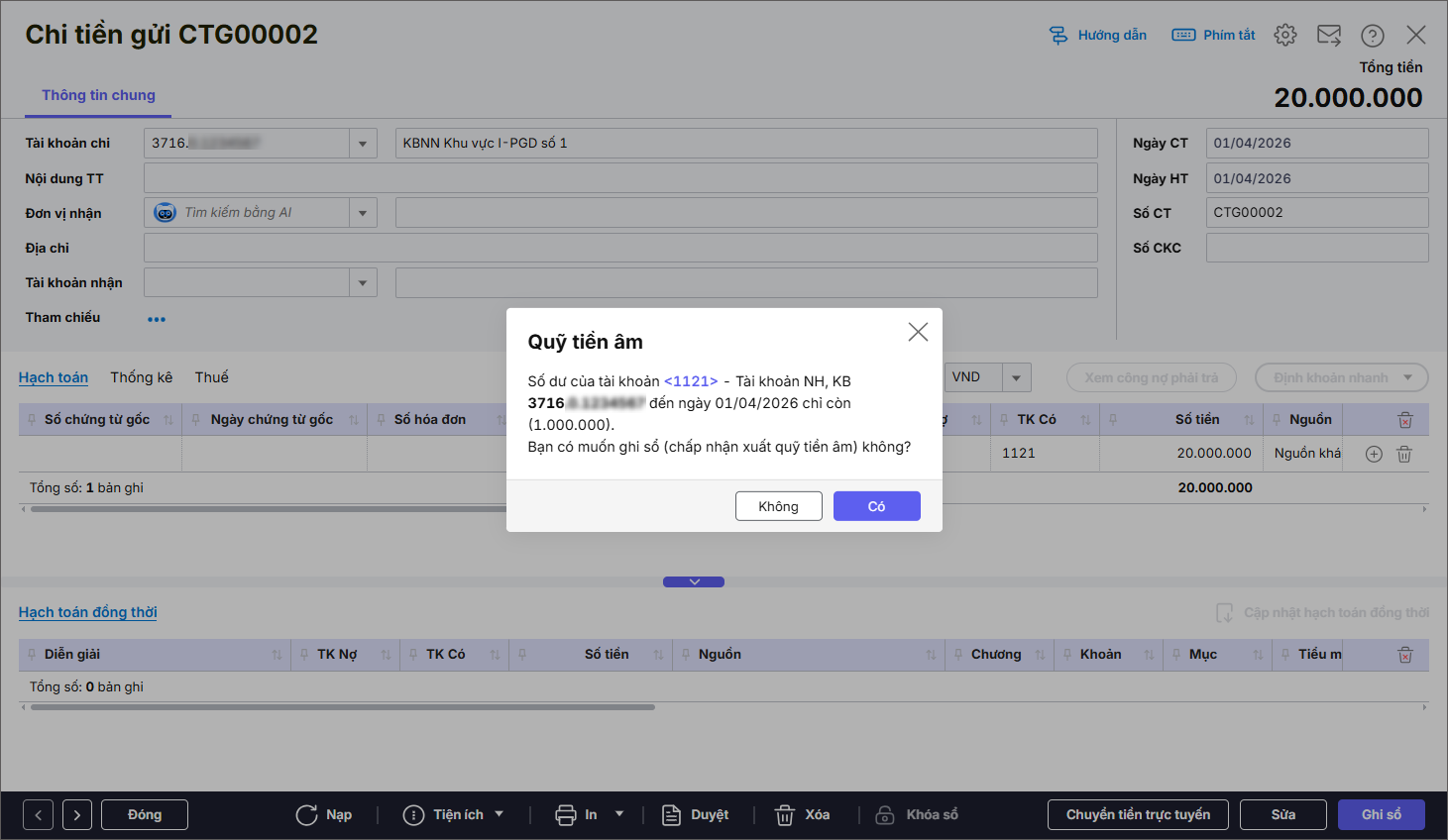Bước 4: Khi ghi sổ chứng từ hạch toán vào Có TK 112x, nếu chi vượt quá số dư của TK, hệ thống sẽ cảnh báo như sau: