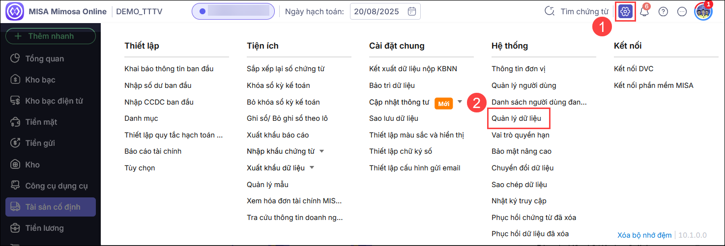 Bước 1: Vào biểu tượng Bánh răng ⚙ (góc phải phía trên) chọn Quản lý dữ liệu.