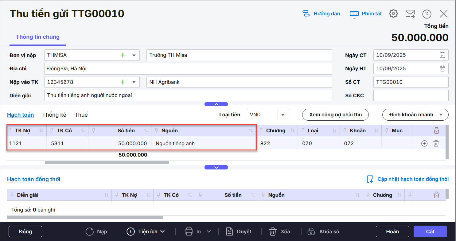 • Tại tab Hạch toán: định khoản TK Nợ 1121, TK Có 5311Số tiền, chọn Nguồn tương ứng được khai báo ở danh mục Nguồn kinh phíCấp phát là Khác, Nghiệp vụ là Không chọn.