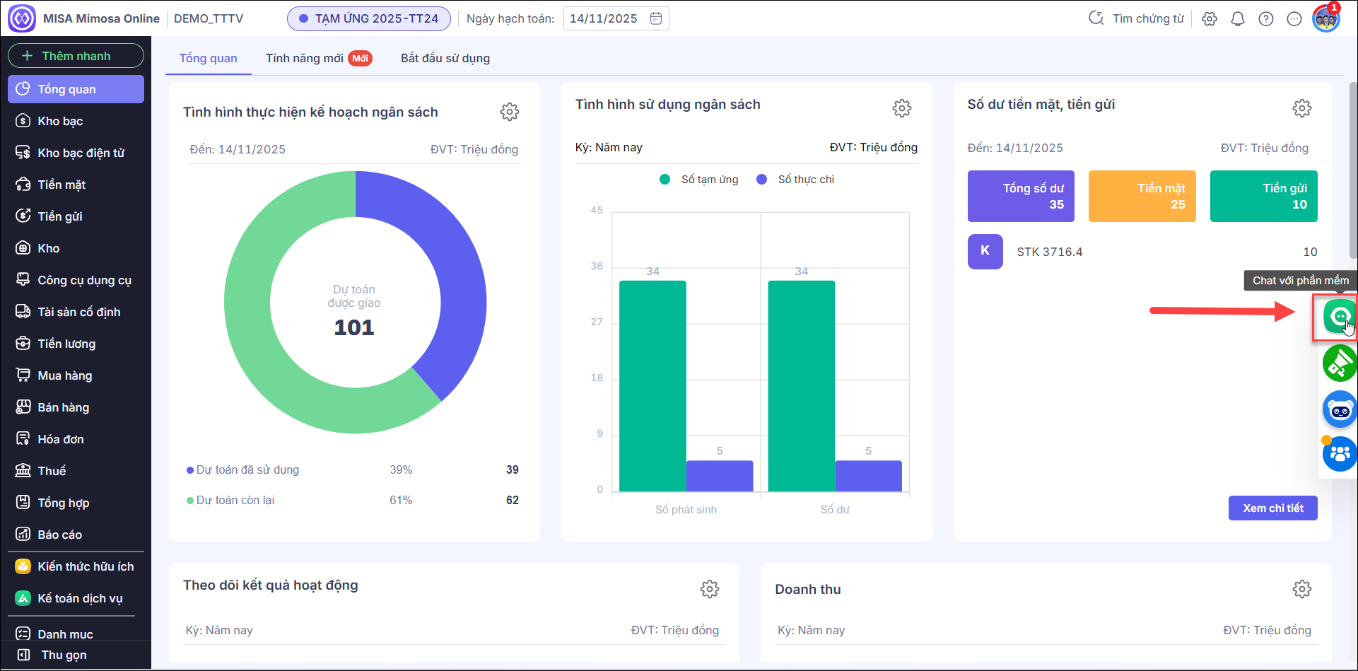 Bước 1: Sau khi đăng nhập vào phần mềm, anh/chị nhấn vào dấu mũi tên bên mép bên phải, nhấn chọn biểu tượng 💬 Chat với phần mềm