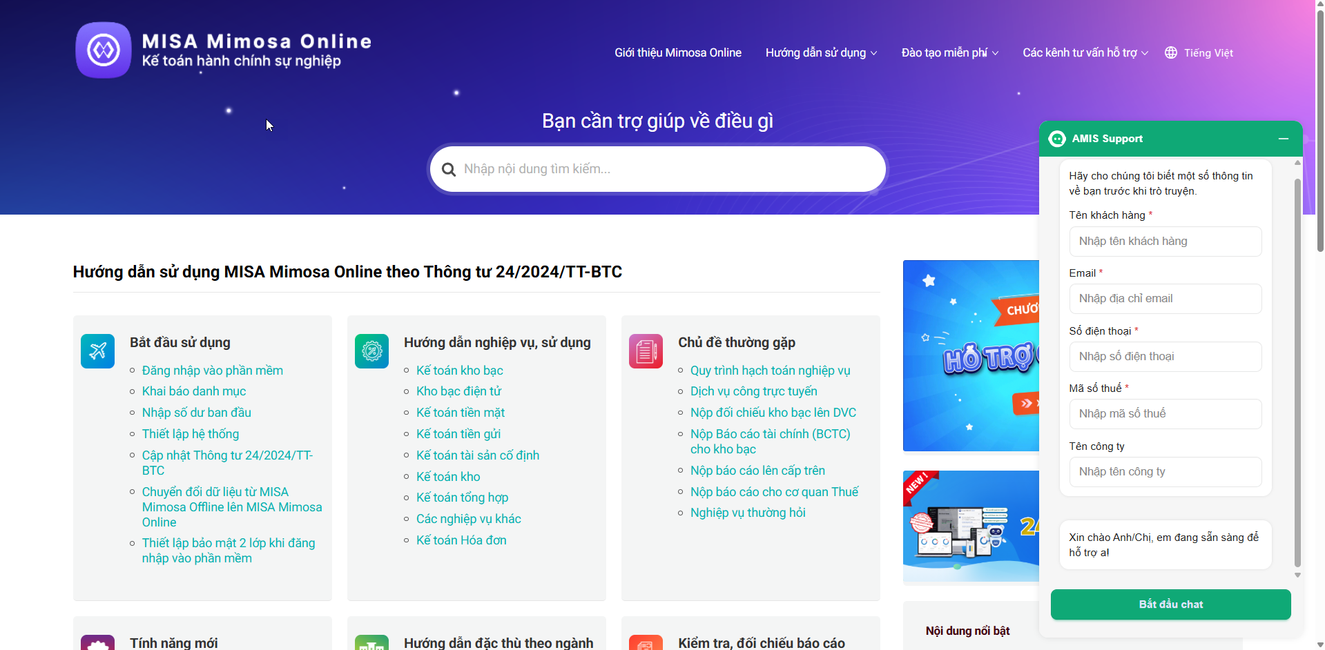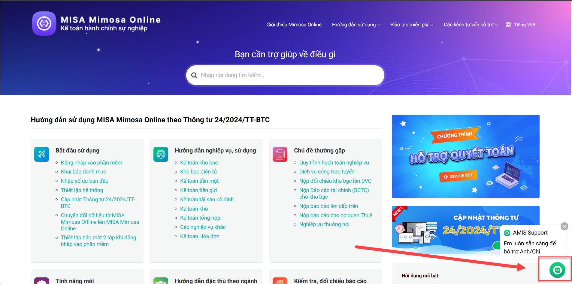Bước 1: Tại màn hình https://helpmimosaonline.misa.vn/, anh/chị chọn vào biểu tượng 💬 AMIS Support