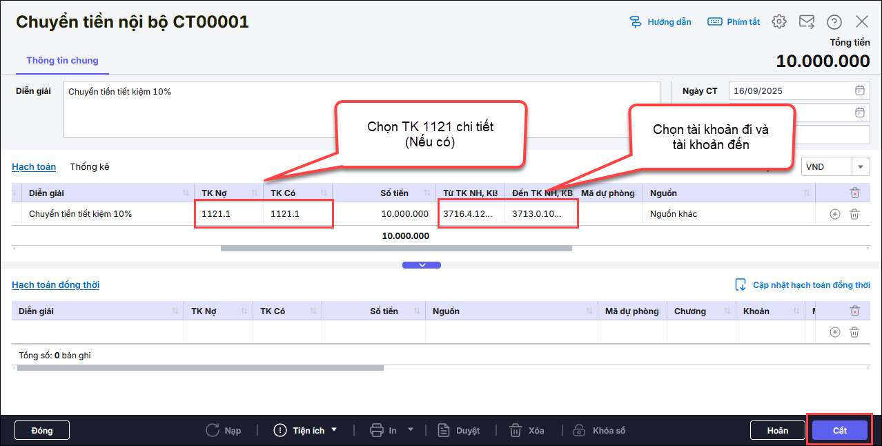 Lưu ý: Khi đơn vị thực hiện chuyển tiền từ TK thu sự nghiệp (TK 3714, 3716) sang TK trích quỹ (TK 3713), Anh/chị vào phân hệ Tiền gửi\Chuyển tiền nội bộ