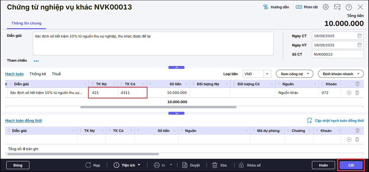 Bước 2: Nhập chi tiết trên chứng từ: TK Nợ 421, TK Có 4311