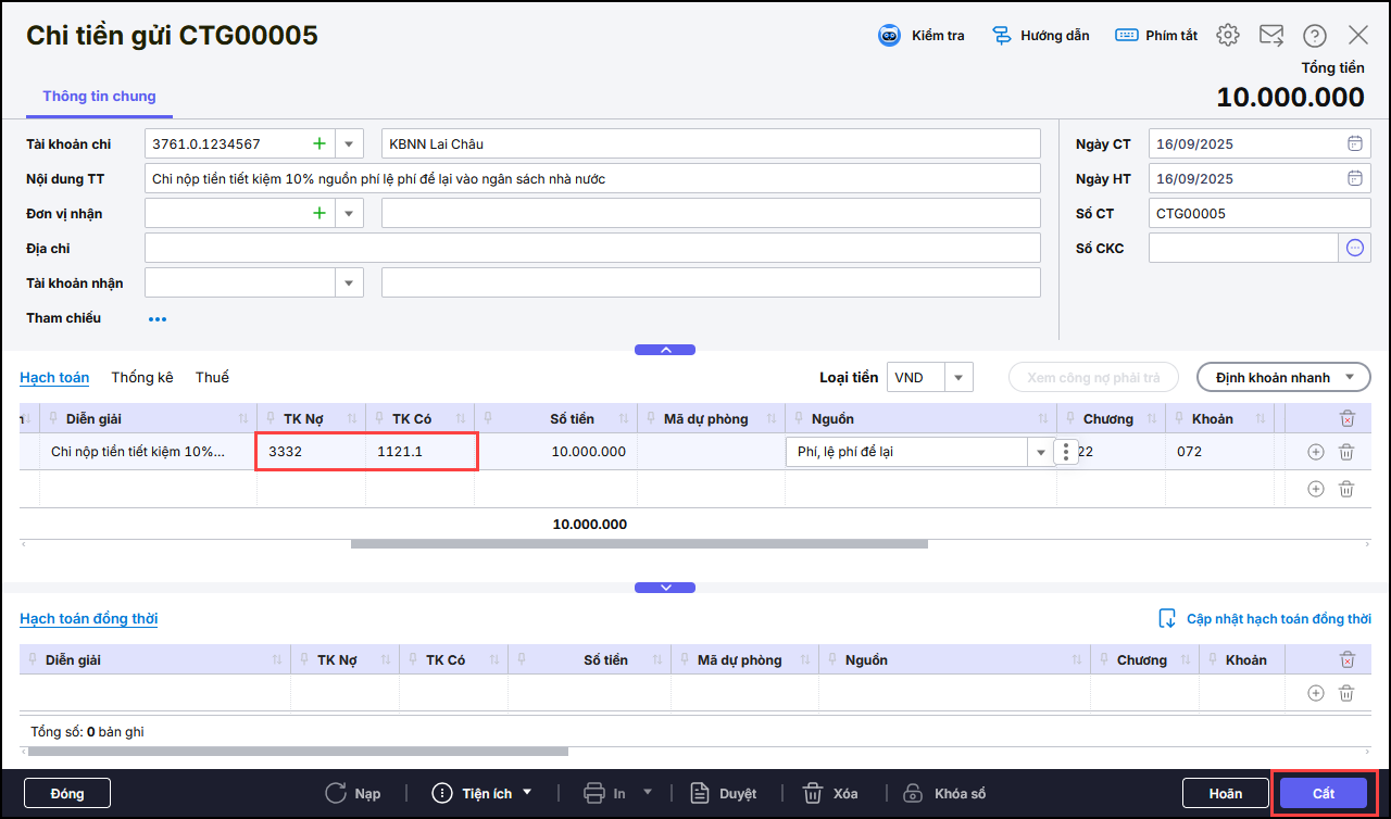 - Nhập chứng từ chi tiết Chọn Tài khoản chi tương ứng