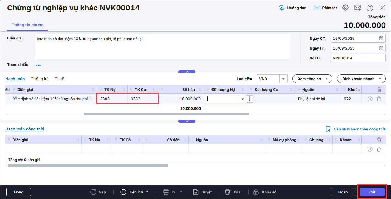 Bài viết hướng dẫn anh/chị cách xác định và hạch toán nghiệp vụ cắt giảm, tiết kiệm 10% năm 2025 theo Nghị quyết số 173/NQ-CP cho các nguồn chi thường xuyên ngân sách nhà nước, nguồn thu sự nghiệp, thu khác được để lại, nguồn thu phí được khấu trừ để lại, đồng thời hướng dẫn thao tác thực hiện trên phần mềm Mimosa Online để theo dõi và quản lý đúng quy định.
