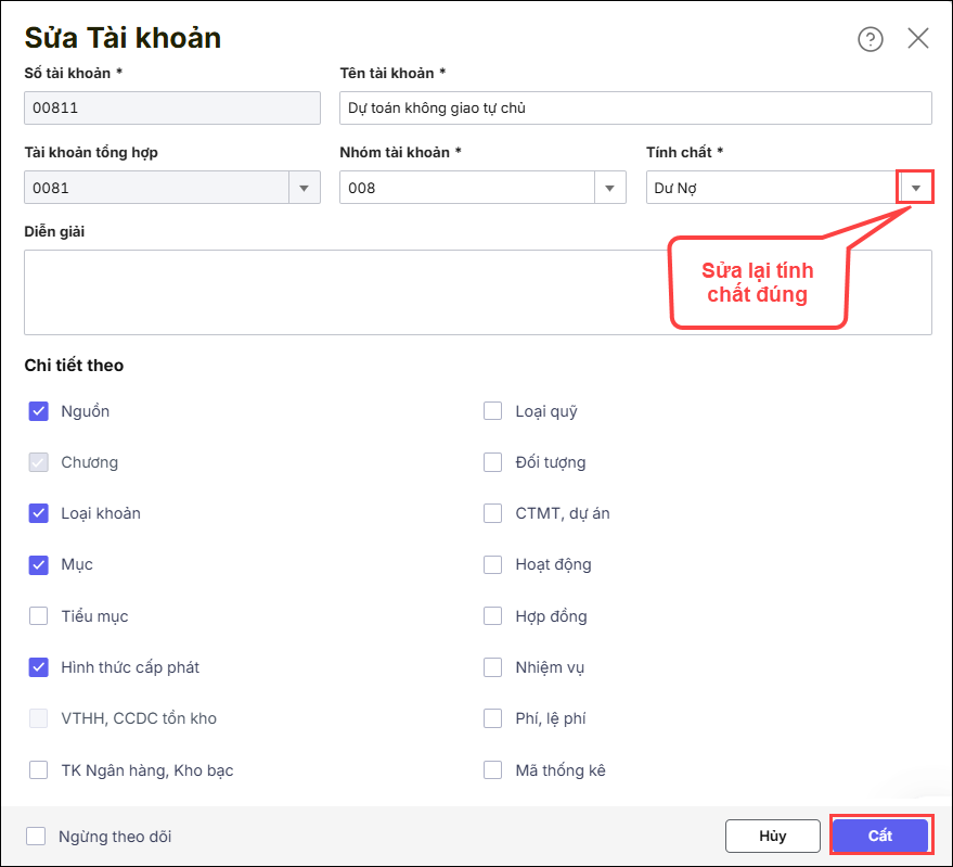 Bước 3: Tích đúp chuột vào TK bị sai tính chất và sửa lại theo tính chất đúng. Nhất Cất