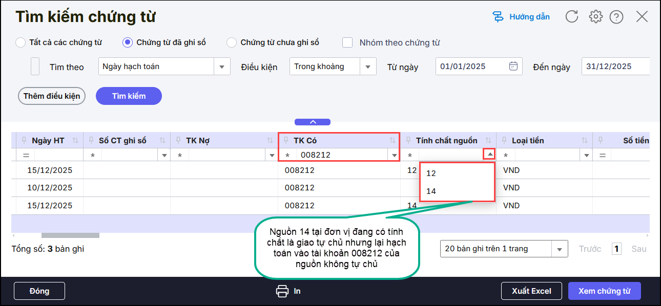 - Lọc TK Có là 00821 tương ứng tính chất nguồn không tự chủ và TK Có 00822 tương ứng tính chất nguồn tự chủ