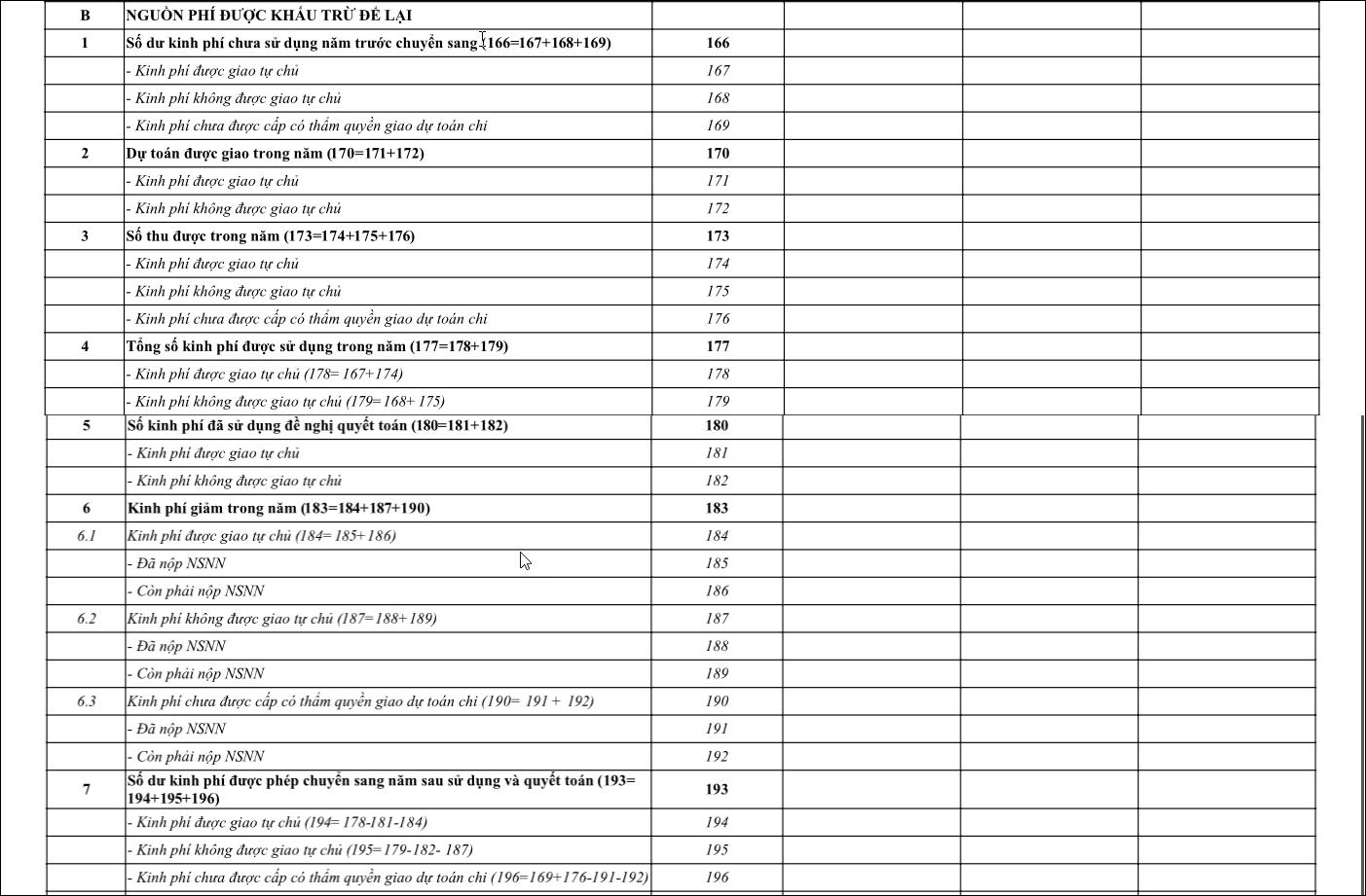 Theo công thức mặc định của phần mềm thì căn cứ lấy lên số liệu của mục B. NGUỒN PHÍ ĐƯỢC KHẤU TRỪ ĐỂ LẠI là số dư và phát sinh của tài khoản 012.