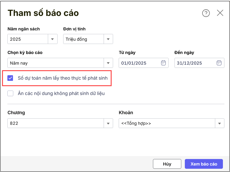 - Khi xem báo cáo tại phần tham số tích chọn “Số dự toán năm lấy theo thực tế phát sinh” thì phần mềm sẽ lấy số liệu trên chứng từ Nhận dự toán