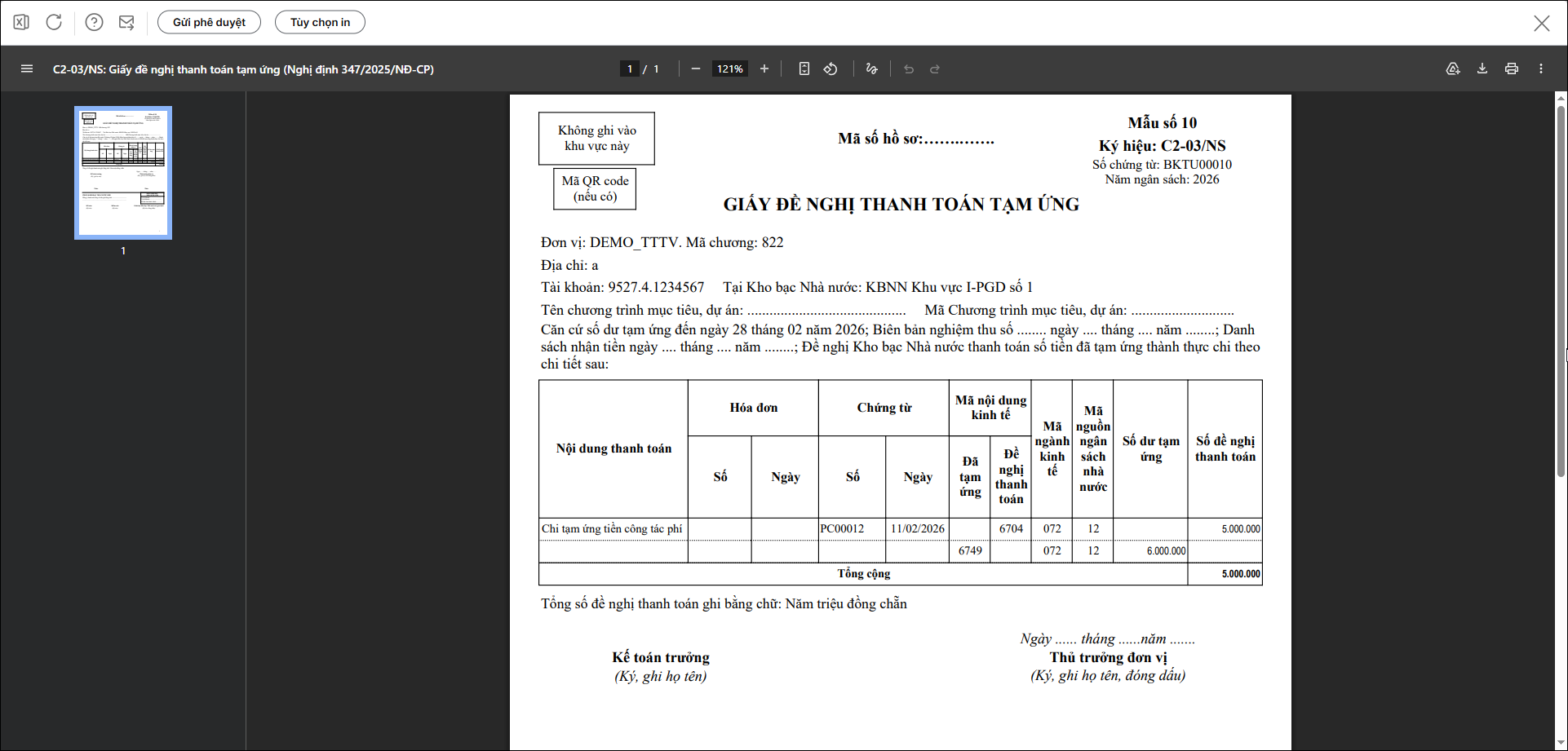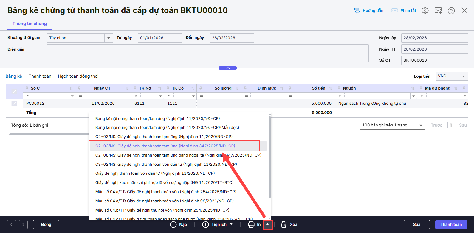 Bước 2: Khi bảng kê ở trạng thái chưa thanh toán, nhấn In\C2-03/NS: Giấy đề nghị thanh toán tạm ứng (Nghị định 347/2025/NĐ-CP)