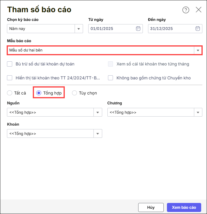 – Chọn Tham số báo cáo là Tổng hợp cho Nguồn , Chương , Khoản