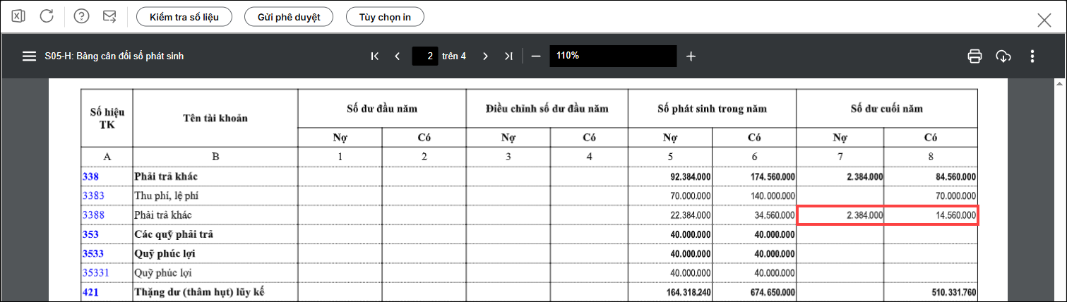 2. Tôi thấy số dư cuối kỳ TK 3388 (phải trả khác) trên S05-H: Bảng cân đối số phát sinh không đúng thì làm thế nào?