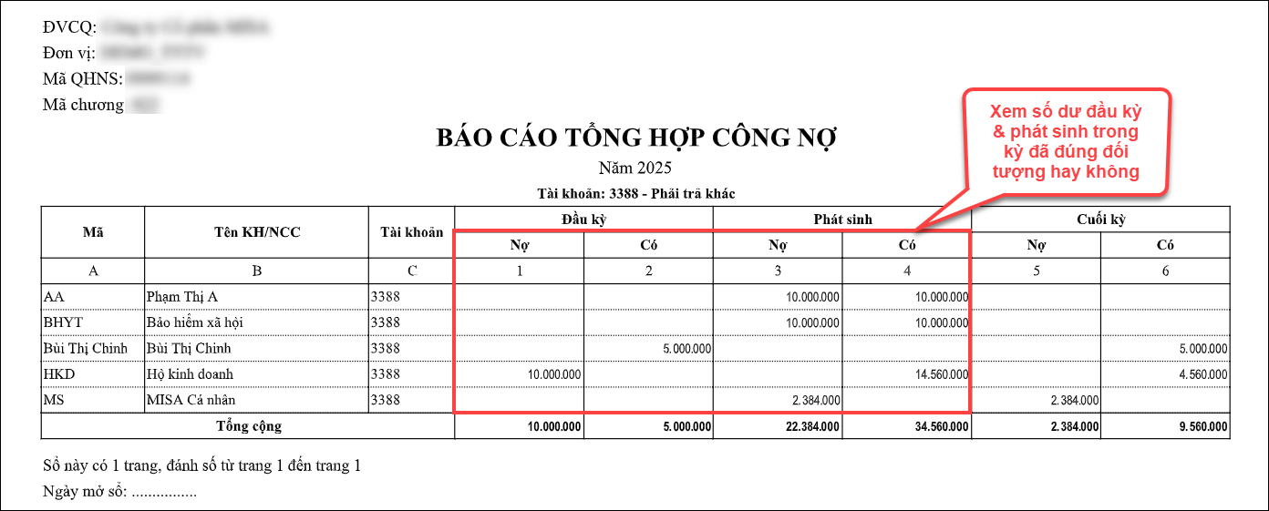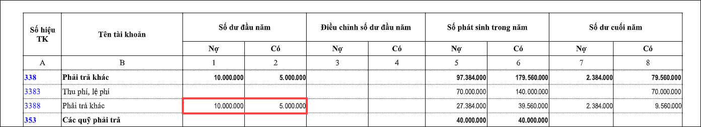 Anh/chị kiểm tra cột số dư đầu năm xem số dư tài khoản 3388 S05 đã khớp đúng với số dư cuối kỳ báo cáo năm trước chưa .
