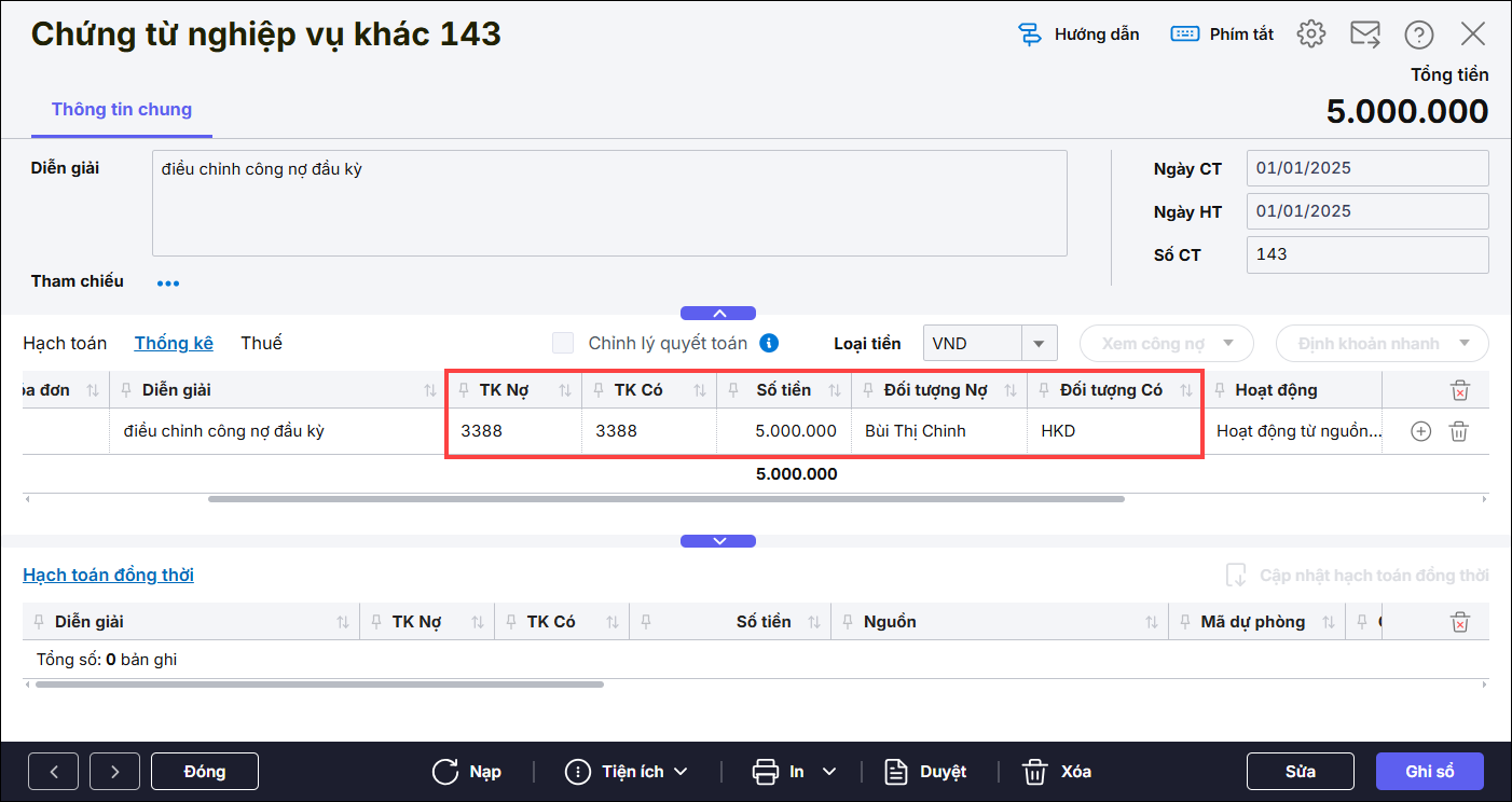 VD như trường hợp trên hình ảnh, thực tế công nợ là 5.000.000 của đối tượng Hộ kinh doanh, nhưng do năm trước có chứng từ 5.000.000 chọn nhầm sang đối tượng Bùi Thị Chinh nên số dư lên như hình. Trường hợp như ví dụ trên hình sẽ hạch toán bù trừ công nợ đầu kỳ như sau: