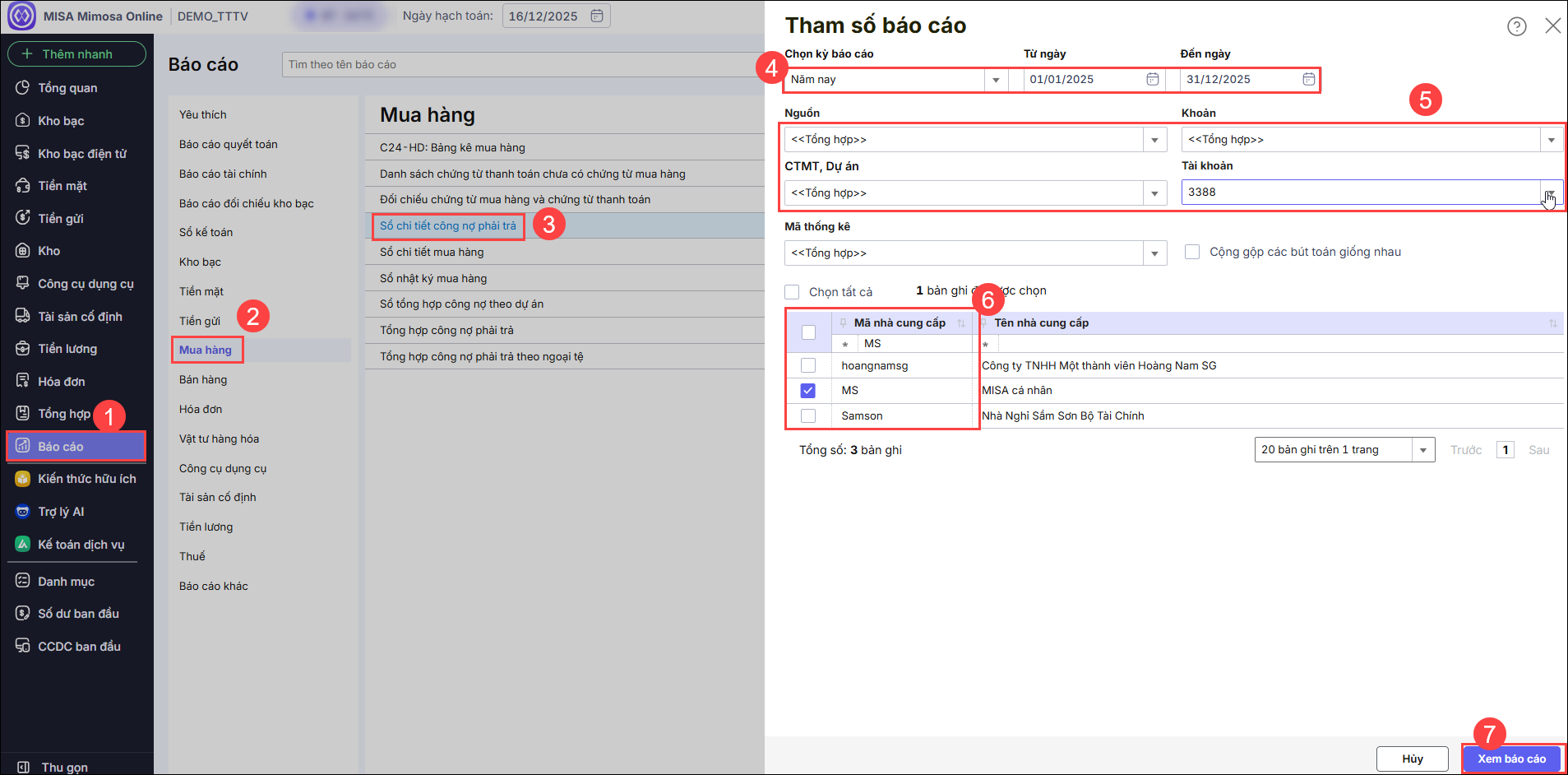 2. Vào Báo cáo\Mua hàng\Sổ chi tiết công nợ phải trả