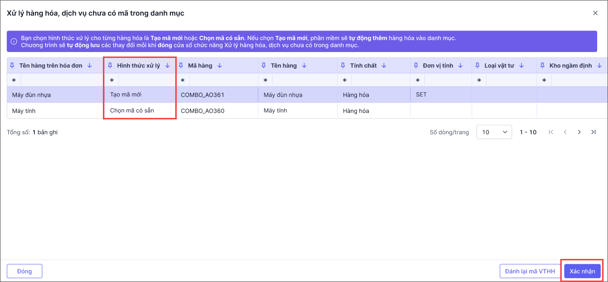 *Lưu ý: Nếu có hàng hóa, dịch vụ chưa có mã trong danh mục, bạn cần chọn hình thức xử lý cho từng hàng hóa.