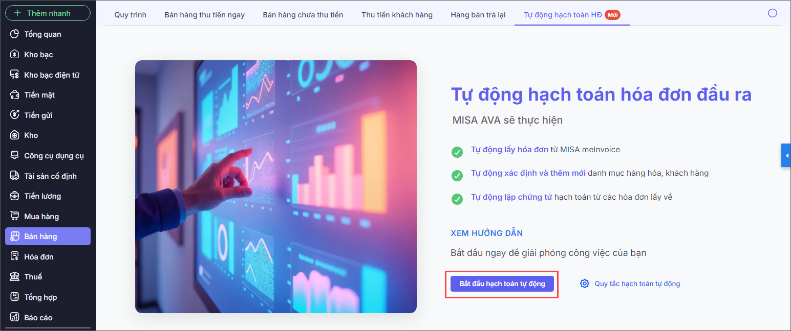 – Kể từ phiên bản R14: Phần mềm tự động xử lý hóa đơn đầu ra với trợ lý số MISA AVA thông qua việc tự động đọc hóa đơn ngay sau khi được lấy về, sau đó tự động xử lý các hóa đơn. Kế toán không cần thực hiện bất kỳ thao tác nhập liệu nào, giúp tiết kiệm thời gian hạch toán, gia tăng năng suất làm việc.