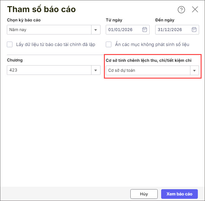 Tùy chọn tham số Cơ sở tính chênh lệch thu, chi/tiết kiệm chi khi lập B04/BCTC