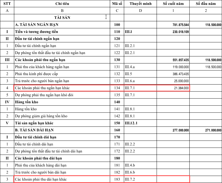 - Tổng 2 chỉ tiêu Các khoản phải thu ngắn hạn khác (mã số 134) và chỉ tiêu Các khoản phải thu dài hạn khác (mã số 183) đang bằng tổng số dư Nợ các TK 137, 1381, 1382, 1385, 1388, 141, 248, 3381, 3382, 3387, 3388 (chi tiết theo từng đối tượng công nợ) và dư Nợ các TK 1383, 3383 ( chi tiết theo Phí, lệ phí) và dư Nợ TK 353, 332, 334.