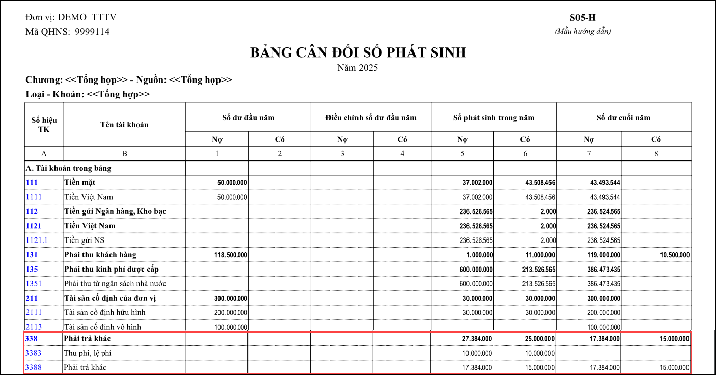Trường hợp đơn vị có phát sinh tại các tài khoản 1383, 3383 và tổng số dư Nợ của các tài khoản 137, 138, 141, 248, 332, 334, 338, 353 trên báo cáo S05-H (Mẫu số dư 2 bên) vẫn không bằng tổng chỉ tiêu 134 và 183, tiếp tục kiểm tra theo mục 3.3. Theo ví dụ minh họa ở trên thì chỉ có dư Nợ TK 3388 là 17.384.000, nhưng chỉ tiêu các khoản phải thu ngắn hạn khác trên báo cáo B01/BCTC đang hiện là 21.384.000, đồng thời đơn vị có phát sinh tài khoản 3383 nên đơn vị sẽ kiểm tra tiếp số dư 3383 chi tiết theo từng loại Phí, lệ phí.