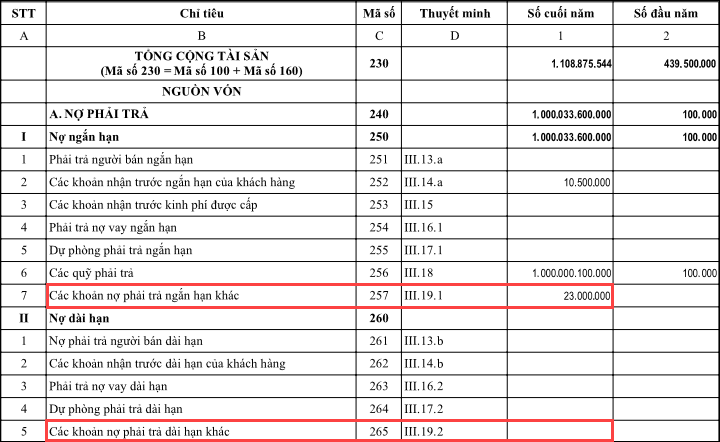 Bước 2: Kiểm tra và cộng tất cả số dư Có cuối kỳ của các TK 133, 138, 332, 333, 334, 338, 348 sẽ bằng với tổng 2 chỉ tiêu Các khoản nợ phải trả ngắn hạn khác (mã số 257) và chỉ tiêu Các khoản nợ phải trả dài hạn khác (mã số 265) trên B01/BCTC: Báo cáo tình hình tài chính.