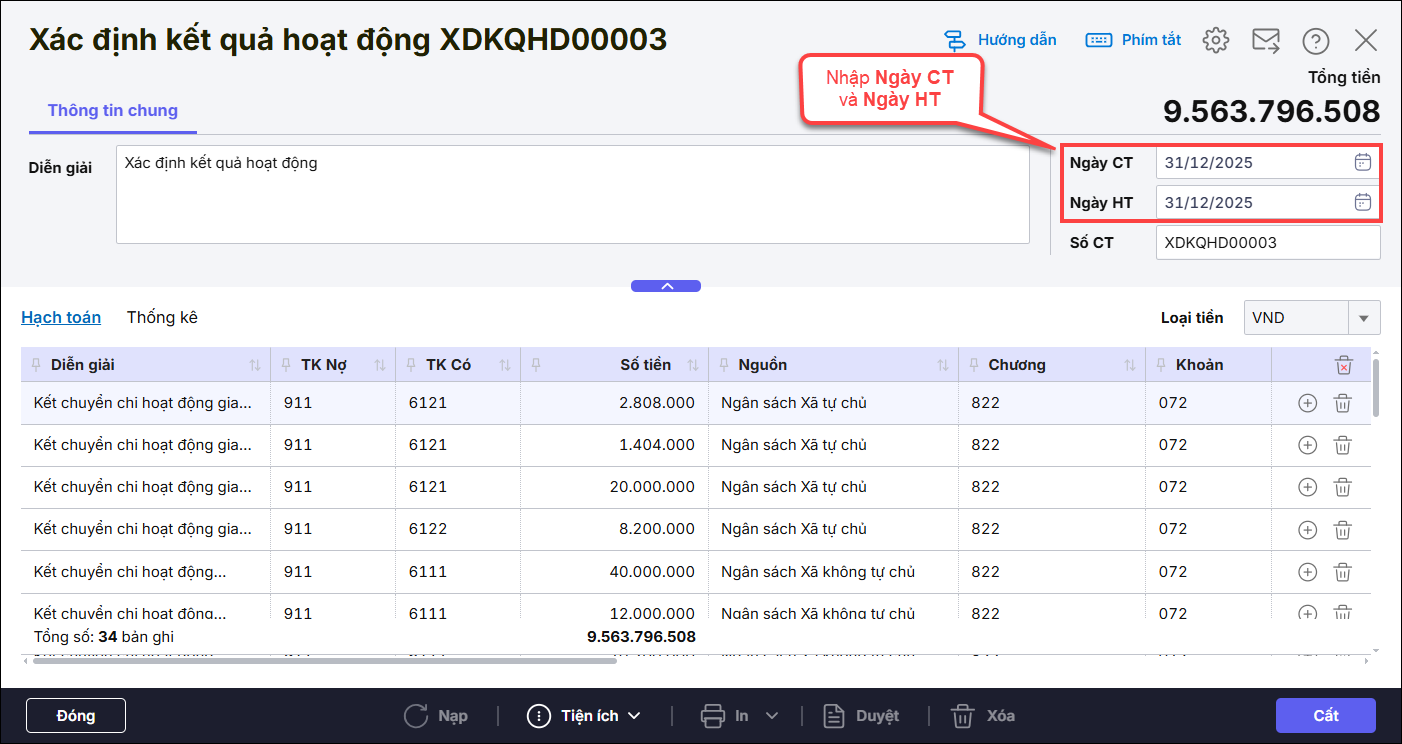 3. Phần mềm tự động Kết chuyển doanh thu, chi phí, anh/chị chọn hoạt động sự nghiệp (nếu cần).