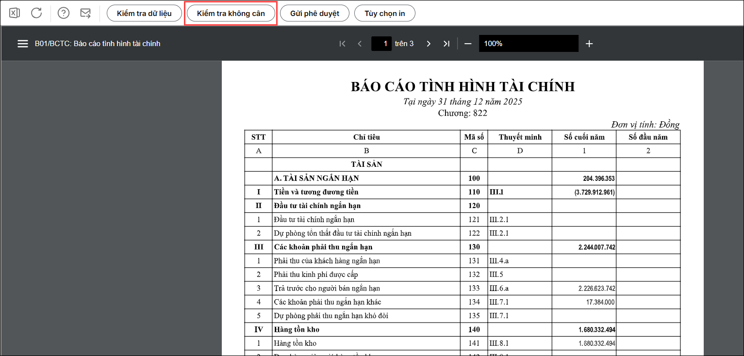 - Trên B01/BCTC, anh/chị tích vào ô Kiểm tra không cân
