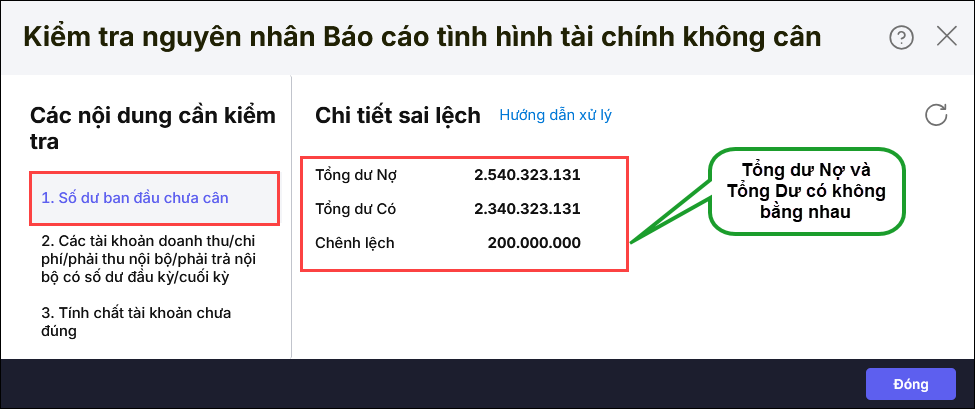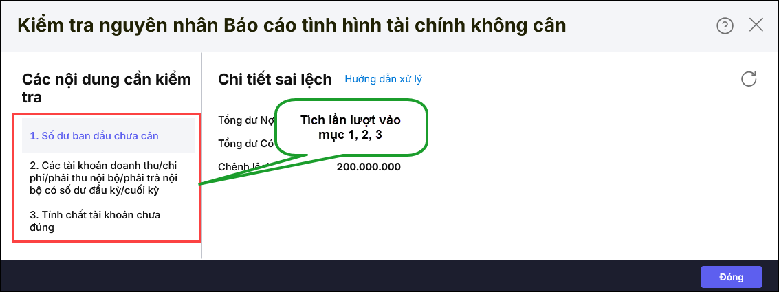 • Trên giao diện các nội dung cần kiểm tra, anh/chị tích vào lần lượt các mục 1,2,3 để xem nguyên nhân dẫn đến  B01/BCTC không cân.