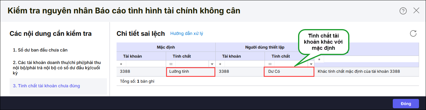 • Anh/chị xem Tài khoản nào đang bị sai tính chất, và tính chất mặc định là gì.