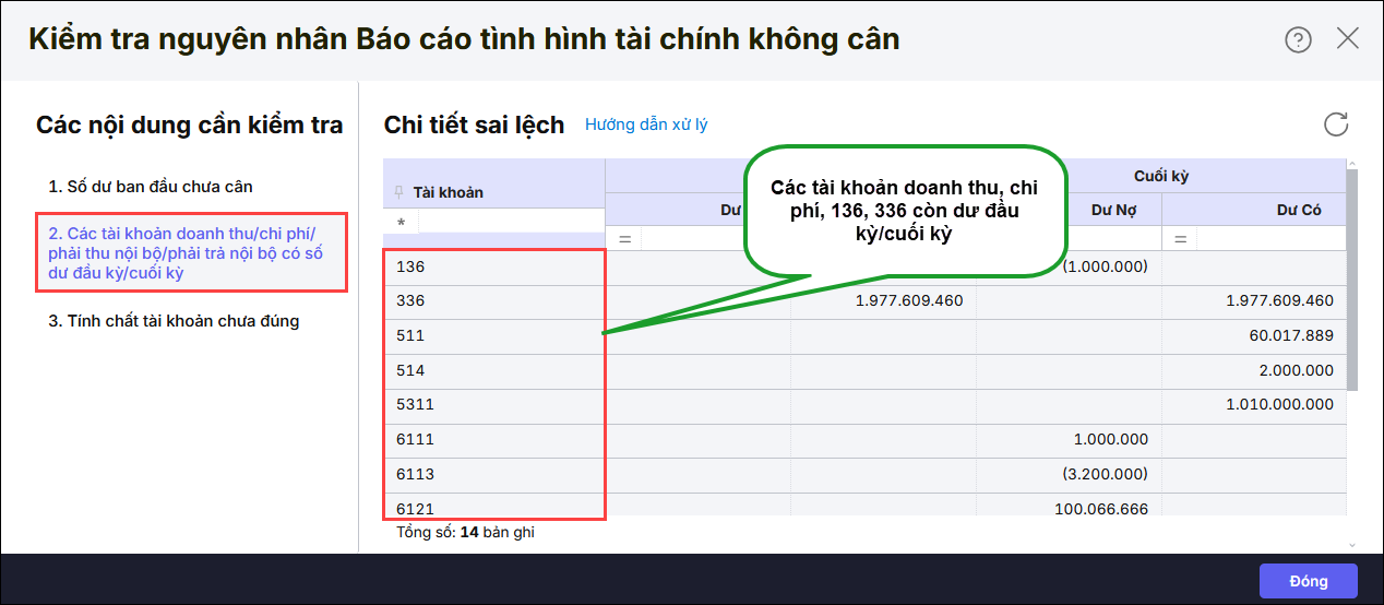 Nguyên nhân 2: Các tài khoản doanh thu/chi phí/phải thu nội bộ/phải trả nội bộ có số dư đầu kỳ/cuối kỳ
