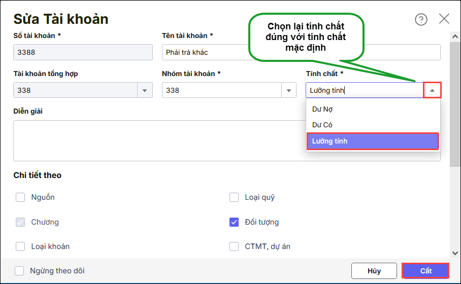 Nguyên nhân 3: Do tính chất Tài khoản chưa đúng với mặc định