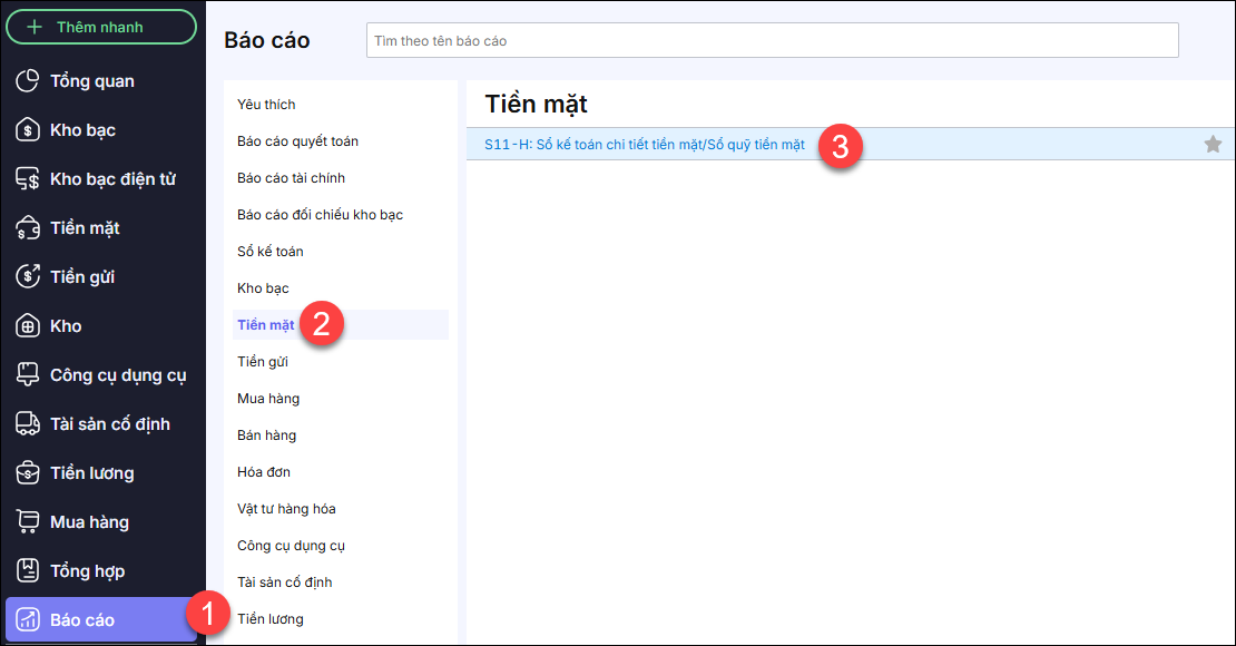 Bước 1: Vào Báo cáo\Tiền mặt, chọn báo cáo S11-H: Sổ kế toán chi tiết tiền mặt/Sổ quỹ tiền mặt