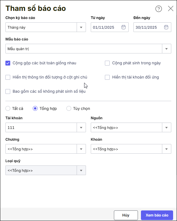 Bước 2: Khai báo các tham số báo cáo như hình .Nhấn Xem báo cáo.
